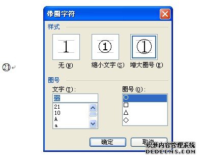 (2)選擇圈號。在"圈號"選擇框中,通過選擇字符外圈的形狀,選擇圓形。